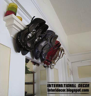 A more creative shoe storage individuals come to mind quite unusual ideas. For example, look at your most beautiful shoes (dress shoes) as the art object and hung on the wall cornice, stumbled against the heel. To enhance the effect cornice can be painted in a bright color or paint with metallic effect.